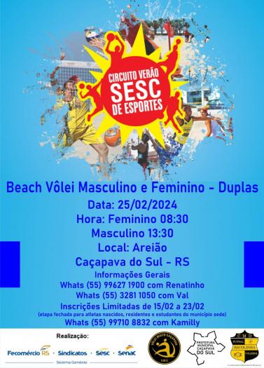 A Prefeitura de Caçapava do Sul, realizará em conjunto com o Sesc, o Circuito Verão Sesc de Voleibol – Duplas, no dia 25 de fevereiro, no Areião, ao lado do Forte Dom Pedro II.