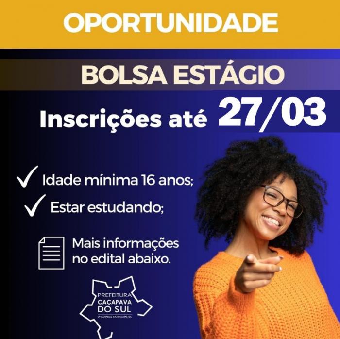 As inscrições ao Processo Seletivo de Estagiários estão sendo realizadas até o dia 27 de março de 2024, das 9 às 15h, na secretaria de Administração do município.