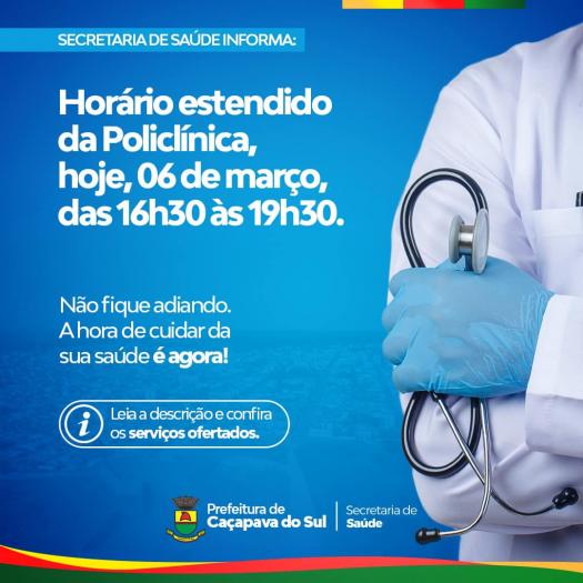 A Prefeitura Municipal, por meio da Secretaria de Saúde, comunica à população que hoje, quarta-feira, 06 de março, o horário da Policlínica será estendido.