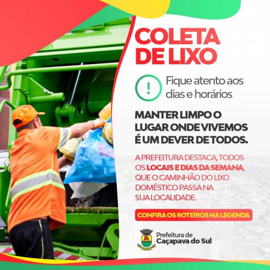 Com o objetivo de colaborar com a população, a prefeitura destaca, todos os locais e dias da semana, que o caminhão do lixo doméstico passa na sua localidade. Confira os roteiros: