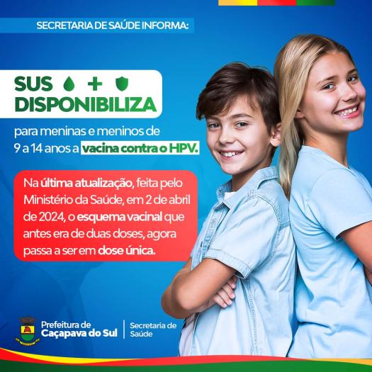 Procure uma unidade de saúde e faça já sua imunização. A secretaria da saúde de Caçapava do Sul, informa que a vacina contra o Papiloma Vírus Humano (HPV), está disponível gratuitamente no Sistema Único de Saúde (SUS)