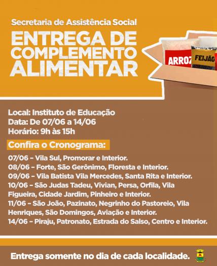 A partir de segunda, dia 07, a entrega dos complementos será das 9h às 15h no Instituto Municipal de Educação, para as regiões Sul, Promorar e Interior.