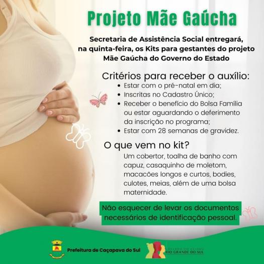 Os kits Mãe Gaúcha contemplarão gestantes, a partir da 28ª semana de gravidez e todas devem estar com o pré-natal em dia, serem inscritas no Cadastro Único, receber o benefício do Bolsa Família ou estar aguardando o deferimento da inscrição no programa.