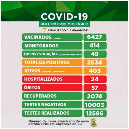 Nesta Quinta-feira, 09 de abril, Caçapava do Sul, apresenta 403 pacientes ativos com a Covid-19.