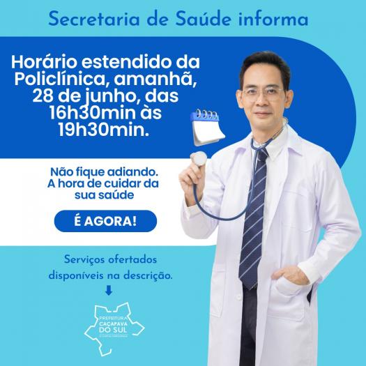 A Prefeitura Municipal, por meio da Secretaria de Saúde, comunica à população que amanhã, 28 de junho, o horário da Policlínica será estendido.