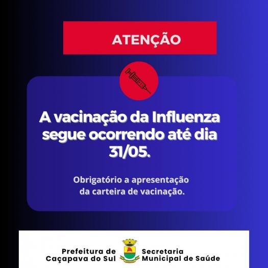 A Secretaria da Saúde comunica, que a campanha de vacinação da Influenza segue ocorrendo até o dia 31/05.
