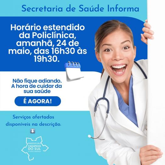 A Prefeitura Municipal, por meio da Secretaria de Saúde, comunica à população que amanhã, 24 de maio, o horário da Policlínica será estendido.