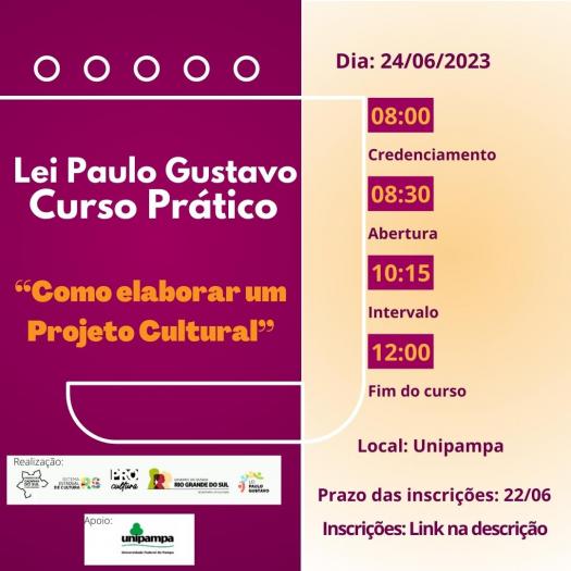 A SECULTUR informa que estão abertas as inscrições para o curso prático voltado a Lei Paulo Gustavo "Como elaborar um Projeto Cultural".