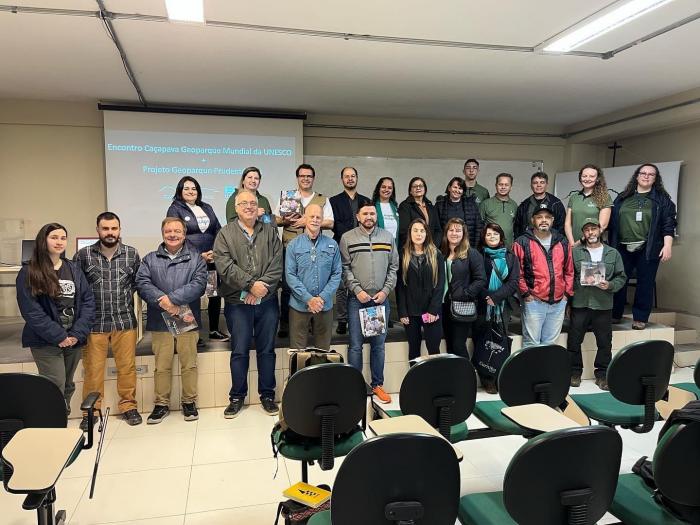 Participam da comitiva de recepção o Coordenador Científico do Geoparque Caçapava André Borba, o Diretor do campus Caçapava José Rojas, a Chefe da Subdivisão de Geoparques Patrícia Freitas e a equipe da SECULTUR.