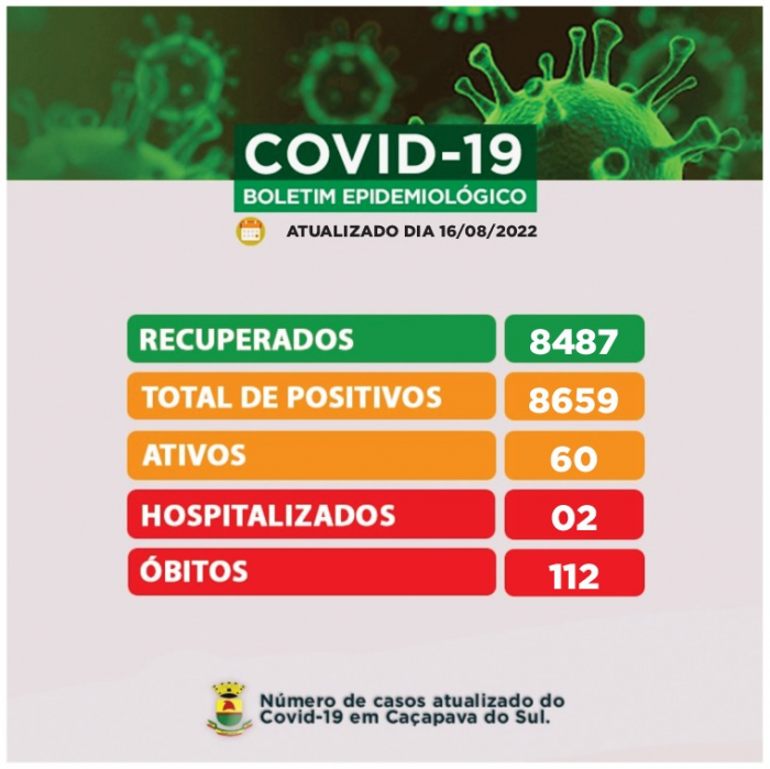 O Boletim desta Terça-feira, 16 de AGOSTO registra 8487 casos RECUPERADOS de Covid 19 em Caçapava do Sul, ou seja +75 casos em relação ao boletim anterior.