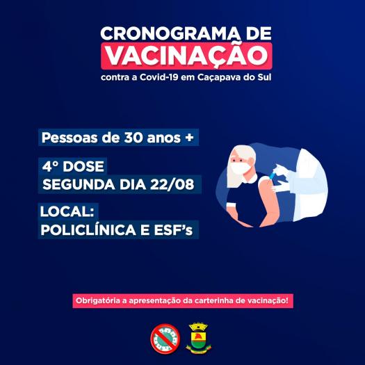 A Prefeitura de Caçapava do Sul, através da Secretaria de Saúde, informa que a partir de hoje, 22/08, a vacinação da quarta dose está liberada para pessoal de 30 anos e mais que já realizaram a quatro meses ou mais a terceira dose.