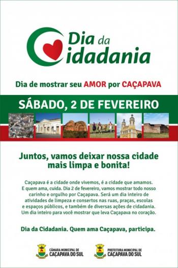 A Prefeitura de Caçapava do Sul está organizando para o dia 02 de fevereiro executar o “Dia da Cidadania”, que consiste em um mutirão de limpeza, conserto de ruas, esgotos e todo o serviço que dependa de infrastrutura dentro da cidade.