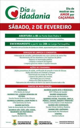 Foi divulgado pela Prefeitura nesta segunda-feira, dia 21, a lista completa dos pontos de referência que cada bairro da cidade terá no Dia da Cidadania. Os locais servirão para atender o público e colaborar com a Prefeitura na limpeza dos principais pontos da cidade.