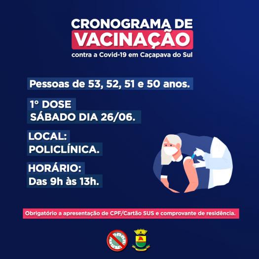 De acordo com o Setor de Epidemiologia, a Secretaria de Saúde fará um dia de Super Vacinação, das 9h às 13h, na Policlínica, para a vacinação das pessoas com 53, 52, 51 e 50 anos, sem comorbidades. Neste dia, serão vacinadas as pessoas atendidas pela Policlínica e Interior do Município. Quem for atendido pelas ESFs poderá realizar a vacina na segunda-feira, dia 28.