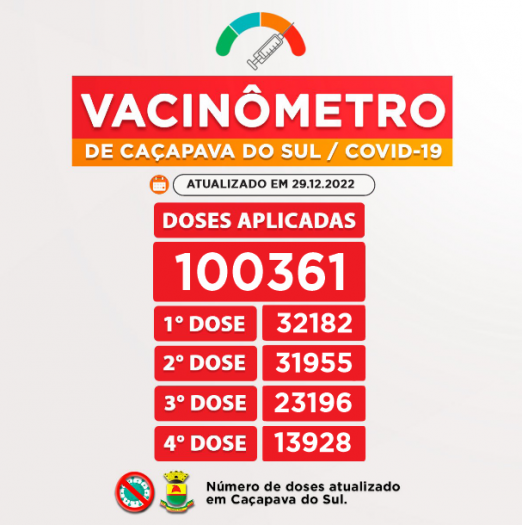 Até o momento foram 100.361 doses aplicadas ao total em Caçapava do Sul, destas, 32.182 foram da primeira dose, 31.955 da segunda dose do imunizante (92,35% da população com esquema vacinal completo), 23.196 da terceira dose (68,98% da população) e 13.928 da quarta dose (41,21% da população) para os grupos já determinados conforme a chegada de cada remessa das vacinas.