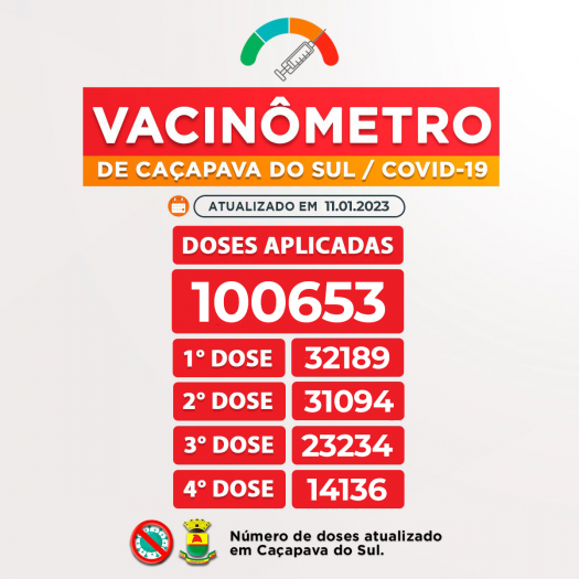Até o momento foram 100.653 doses aplicadas ao total em Caçapava do Sul, destas, 32.189 foram da primeira dose, 31.094 da segunda dose do imunizante (92,47% da população com esquema vacinal completo), 23.234 da terceira dose (69% da população) e 14.136 da quarta dose (42,04% da população) para os grupos já determinados conforme a chegada de cada remessa das vacinas.