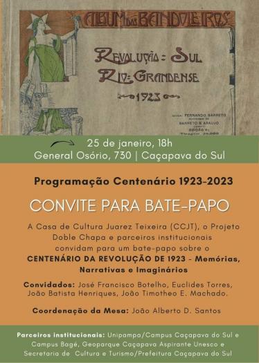 Logo mais tem um bate papo histórico -literário sobre os 100 anos da Revolução Sul Rio Grandense na Casa de Cultura Juarez Teixeira. Imperdível!
