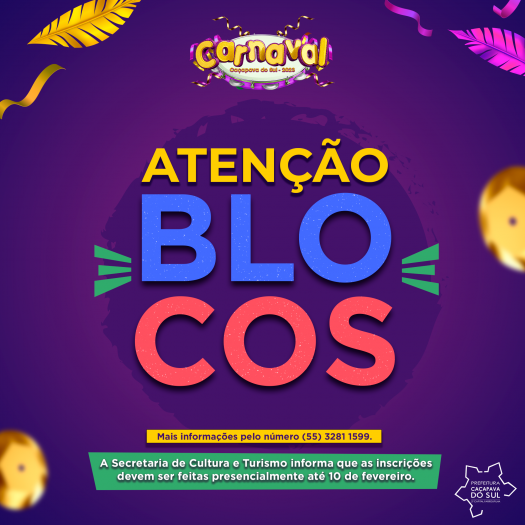 A Prefeitura de Caçapava do Sul, através da Secretaria de Cultura e Turismo, convida os blocos caçapavanos a participarem do Carnaval de rua do município.