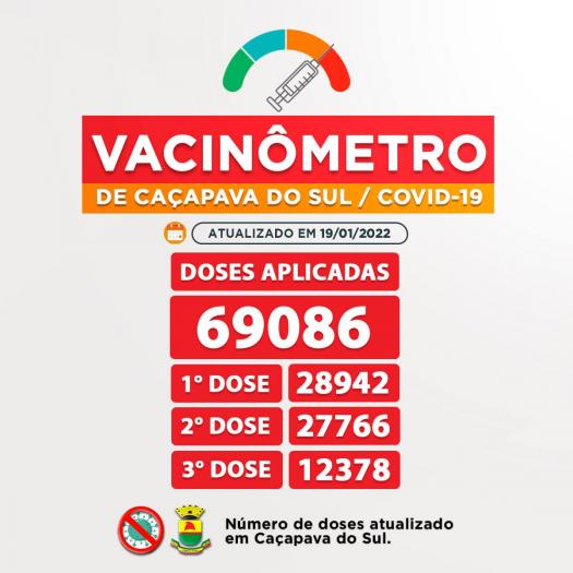 Até o momento foram 69.086 doses aplicadas ao total em Caçapava do Sul, destas, 28.942 foram da primeira dose, 27.766 da segunda dose do imunizante (82,5% da população com esquema vacinal completo) e 12.378 da terceira dose (36,8% da população) para os grupos já determinados conforme a chegada de cada remessa das vacinas .