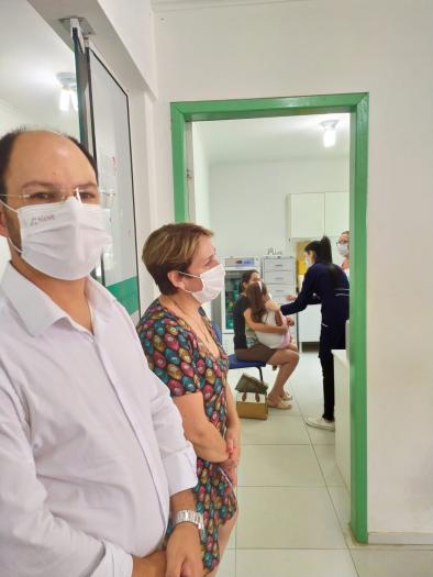 O prefeito Giovani Amestoy, acompanhado da Secretária de Saúde Inês Salles esteve na Policlínica Municipal no momento que as primeiras crianças foram vacinadas.