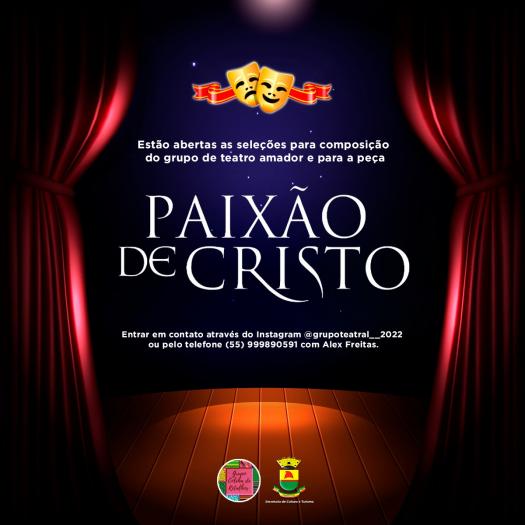 A SECULTUR juntamente com o Grupo de Teatro Colcha de Retalhos informa que estão abertas as seleções para composição do grupo de teatro amador e para a peça "A Paixão de Cristo", os interessados poderão entrar em contato através do Instagram @grupoteatral__2022 ou pelo telefone (55) 999890591 com Alex Freitas.
