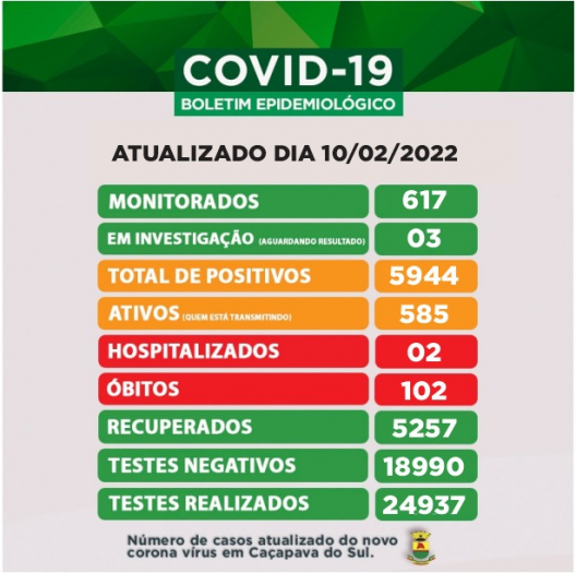 O Boletim desta quinta-feira, 10 de fevereiro registra nova alta nos casos ativos de Covid 19 em Caçapava do Sul.