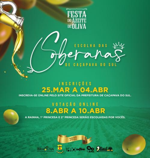 A Prefeitura Municipal de Caçapava do Sul, em parceria com a Associação de Produtores de Azeite Caçapavanos, da IBRAOliva e Agências Publique e FullPlay Eventos informa que estão abertas as inscrições para o Concurso da escolha das Soberanas da Iª Festa do Azeite de Caçapava do Sul – Berço da Olivicultura do RS, que ocorrerá de 27 a 29 de maio.