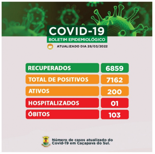 O Boletim desta Segunda-feira, 28 de março registra 6859 casos RECUPERADOS de Covid 19 em Caçapava do Sul, ou seja +76 casos em relação ao boletim anterior.