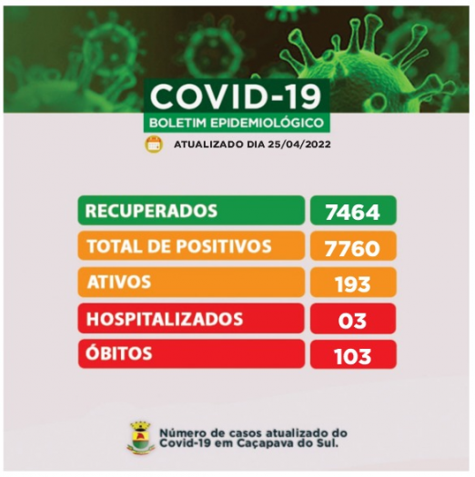 O Boletim informa ainda que há três paciente internados em razão da Covid-19 e que Caçapava do Sul contabiliza até o momento 103 ÓBITOS por Covid-19.