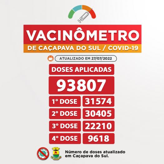 Até o momento foram 83.619 doses aplicadas ao total em Caçapava do Sul, destas, 31.483 foram da primeira dose, 30.171 da segunda dose do imunizante (89,73% da população com esquema vacinal completo), 20.247 da terceira dose (60,21% da população) e 2709 da quarta dose (8,05% da população) para os grupos já determinados conforme a chegada de cada remessa das vacinas.