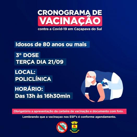 A Prefeitura de Caçapava do Sul, através da Secretaria de Saúde de Caçapava do Sul informa que terça-feira, dia 21 de setembro, dará início a vacinação de 3ª dose para idosos de 80 anos ou mais. O horário de vacinação na Policlínica para a 3° dose será a partir das 13h até às 16h30min. Nos ESF’s a vacinação ocorre conforme agendamento.