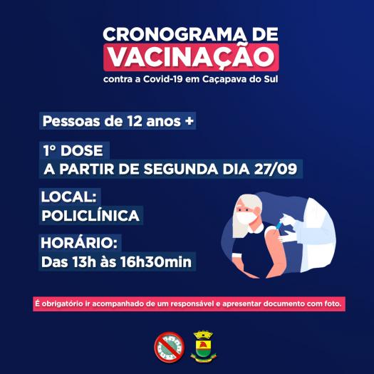A Secretaria de Saúde de Caçapava do Sul informa que quarta-feira dia 04 de agosto, tem vacinação de 1ª dose para pessoas de 32 anos ou mais das 13h às 17h na Policlínica e nos ESF’s o agendamento deve ser feito conforme a rotina.
