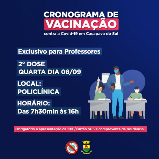 A Prefeitura de Caçapava do Sul, através do Setor de Epidemiologia, da Secretaria de Saúde, informa que nesta quarta-feira (08/09), temos a aplicação da segunda dose da vacina exclusiva para professores.
