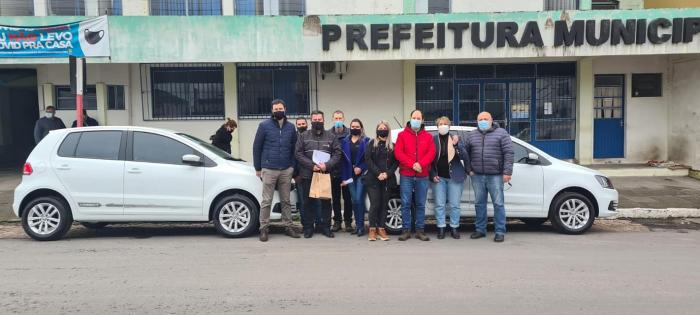 O prefeito Giovani Amestoy, acompanhado da Secretária de Saúde, Ines Salles, dos vereadores Jussarete Vargas (PDT) e Luiz Fernando Torres-Boca (PT), e dos servidores da Saúde e Fazenda, receberam na manhã desta sexta-feira, dia 10, dois veículos 0km adquiridos em parceria entre a Prefeitura e Câmara para transporte de pacientes da saúde do município.
