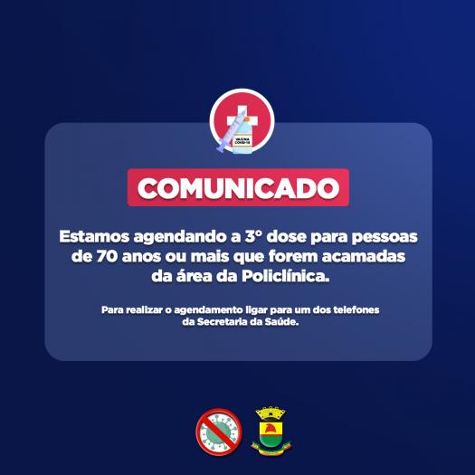 A Prefeitura de Caçapava do Sul, através da Secretaria de Saúde de Caçapava do Sul informa que estão agendando a 3° dose para pessoas de 70 anos ou mais que forem acamadas da área da Policlínica.
