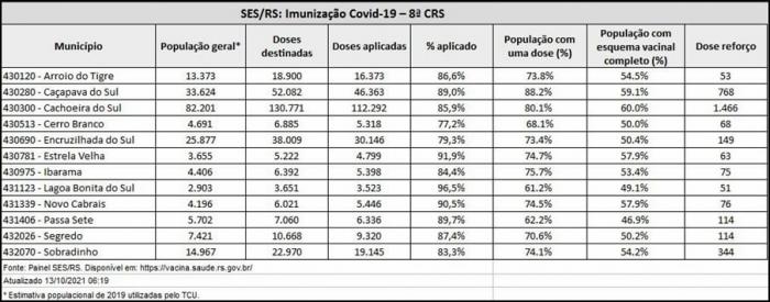 Caçapava do Sul é o município com maior percentual de vacinação no quesito pelo menos uma dose e segundo município no quesito esquema vacinal completo. A informação, divulgada esta semana, é do Sistema de Monitoramento da 8ª Coordenadoria Regional de Saúde e confirma o empenho e agilidade da Secretaria Municipal de Saúde de Caçapava do Sul no combate a Pandemia de Coronavírus.