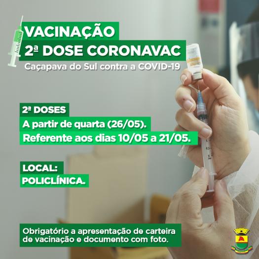 A Secretaria de Saúde de Caçapava do Sul informa que nesta semana deve finalizar a aplicação das segundas doses da CoronaVac em atraso na população caçapavana. As pessoas que retiraram as fichas de atendimento para a vacinação que estava prevista para dia 30 de abril, 03 a 07 de maio, poderão procurar a Policlínica seguindo a programação abaixo: