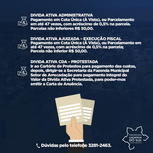 A Prefeitura Municipal, através da Secretaria da Fazenda, informa que os contribuintes do município que estão abertos os prazos para parcelamento de dívida ativa em cobrança administrativa desde que não esteja ajuizada e nem enviada para protesto ou protestada.