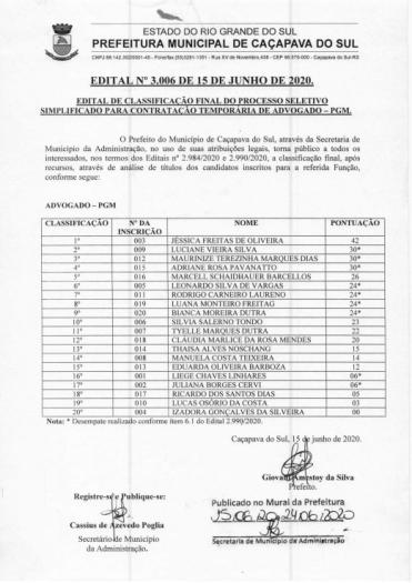 Divulgado o edital nº 3006 de 15 de junho de 2020. Edital de Classificação ao Processo Seletivo Simplificado para Contratação Temporária de Advogado - PGM.Clique no link para acessar o documento em PDF ou copie e cole no seu navegador.