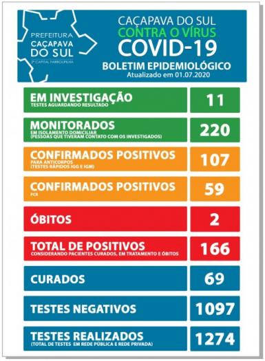 A Secretaria de Saúde da Prefeitura, através do Departamento de Epidemiologia de Caçapava do Sul, atualizou nesta quarta-feira (01), os dados sobre a pandemia de Covid-19 no Município. Foram feitos mais de 1.274 testes no município (entre rede pública e privada).