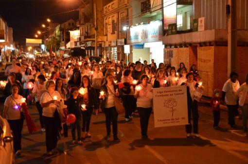 Integrando a programação especial de aniversário do Município, na noite dessa quarta-feira, 23, a Liga Feminina de Combate ao Câncer de Caçapava do Sul organizou uma caminhada luminosa que saiu da Casa da Liga, ao lado do Hospital de Caridade, e terminou no Largo Farroupilha.