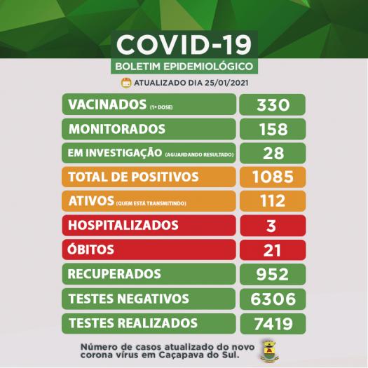 Com mais 30 testes realizados desde o último boletim no dia 22/01/21, Caçapava do Sul registra nesta segunda-feira, dia 25/01/21, -08 novos casos ativos de Covid-19, chegando a 112 pessoas que transmitem o vírus. O número de recuperados aumentou, sendo 13 pessoas a mais em relação ao boletim anterior, chegando a um total de 952 curados de Covid-19.