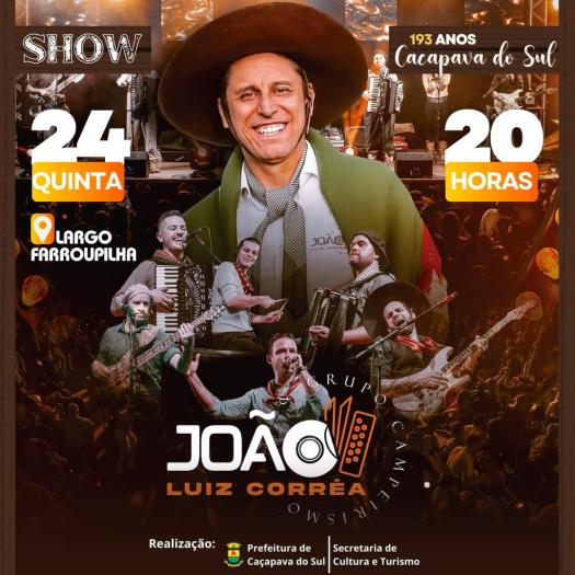 Em comemoração aos 193 anos de Caçapava do Sul, a Prefeitura Municipal, através da Secretaria de Cultura e Turismo, promete abrir as comemorações, na véspera de aniversário, dia 24, com um grande show gratuito: João Luiz Corrêa e Grupo Campeirismo.