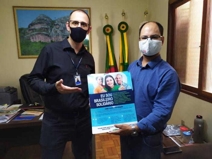 Amestoy recebeu das mãos de Salvador, cartazes da campanha “EU SOU BRASILEIRO SOLIDÁRIO” que ensina como fazer a doação de parte do IR e que foram enviados para fixação nas secretarias do município.