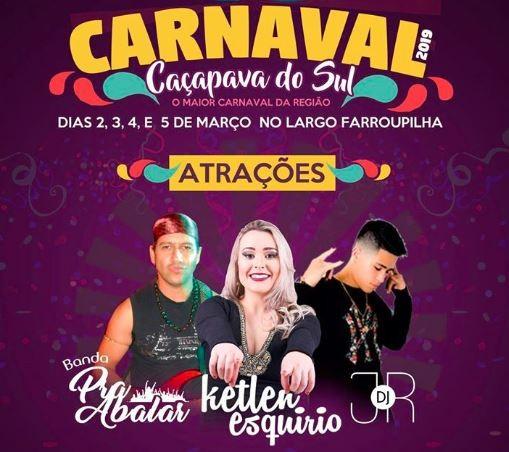 Atracões: Banda Pra Abalar; DJ Jr e a lavrense Ketlen Esquírio (que já se apresentou em Carnavais da região e faz shows em dezenas de cidades do Estado).