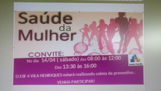 Com objetivo de prevenir o câncer de colo de útero, a Secretaria da Saúde promove neste sábado (14), no Posto de Saúde da Vila Henriques – ESF 4, a coleta de preventivos.