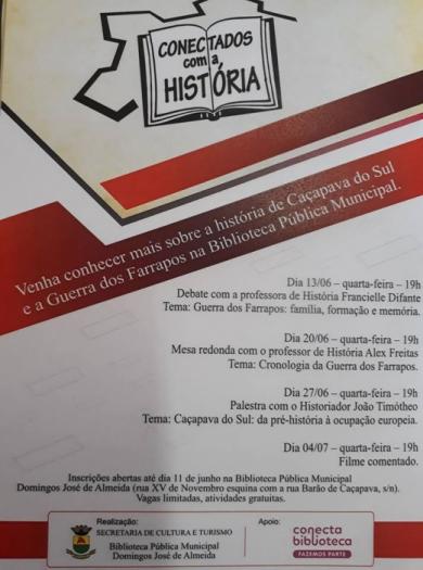 Para atender a demanda, já na próxima quarta-feira, dia 13 de junho, acontece o primeiro encontro a partir das 19h. O tema do debate é “Guerra dos Farrapos: família, formação e memória” com a professora de História Francielle Difante.