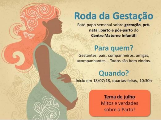 A partir do dia 18 de julho começará a acontecer semanalmente, nas quartas-feiras, a Roda da Gestação, com bate-papo sobre gestação, parto e pós-parto. Gestantes, pais, amigos e acompanhantes serão bem-vindos nos encontros. A temática do mês de julho será “Mitos e Verdades sobre o parto”.