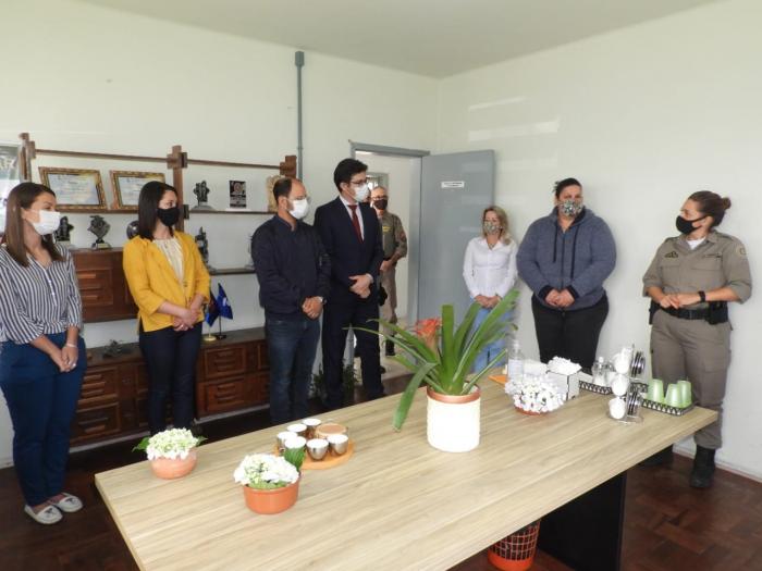 Estiveram presentes o Juiz de Direito Dr. Luis Felipe Lemos Almeida, o Promotor de Justiça, Dr. Gabriel Munhos Capelani, a Coordenadora do CREAS Mariana de Freitas Mesquita da Costa, a Vereadora Mirella Fernandes Biacchi, representando o Legislativo Municipal, o 1º Sgt Diego Pereira, representando o Comando do Esquadrão e a Sd Teresa Leal dos Santos, habilitada para a Patrulha Maria da Penha.
