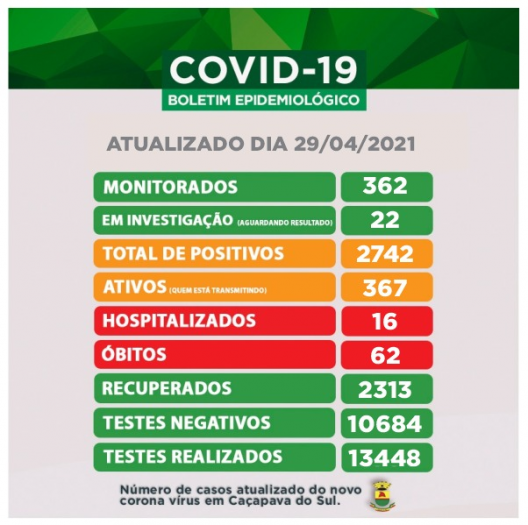 Nesta quinta-feira, 29 de abril, Caçapava do Sul, apresenta 367 pacientes ativos com a Covid-19.